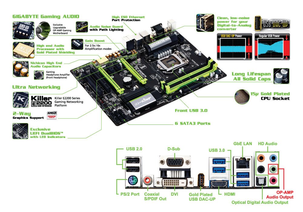 GIGABYTE motherboards use the highest quality Nichicon high end audio capacitors.These professional audio capacitors deliver the highest quality sound resolution and sound expansion to create the most realistic sound effects for professional gamers.