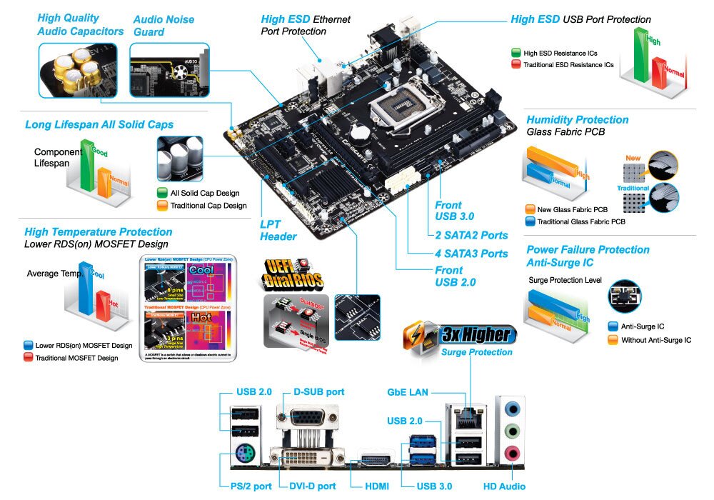 GIGABYTE 8 Series motherboards raise the bar in terms of protecting your system, providing advanced electrostatic discharge (ESD) protection for both your Ethernet LAN and USB ports, both common sources of ESD-related failures. Each LAN and USB port is paired with a dedicated protection filter that can withstand high electrostatic discharges, protecting your system from common electrical surges and even direct lighting strikes.