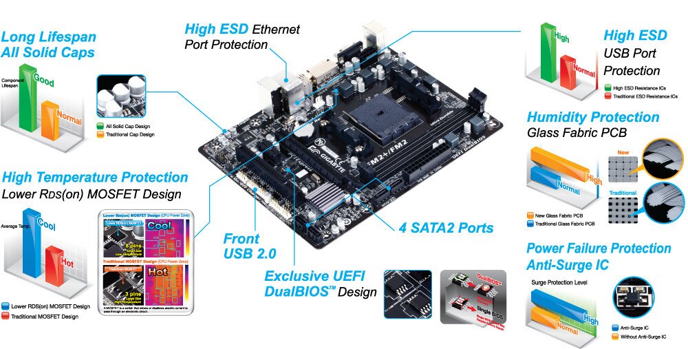 GIGABYTE uses Solid Caps (Capacitors) for APU VRM and Low RDS(on) MOSFETs which are rated to work at higher temperatures to provide a longer lifespan.