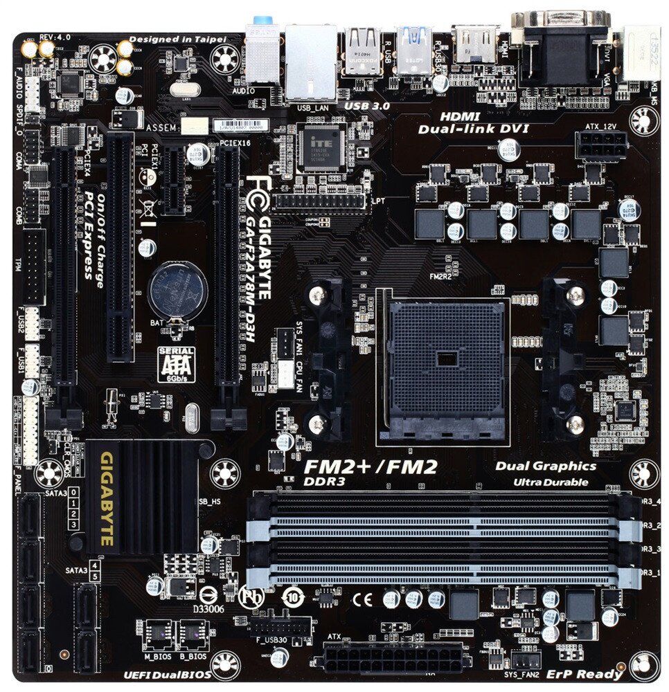 GIGABYTE FM2+ series motherboards based on AMD A78 chipset and feature the new FM2+ APU socket, and are designed to get the most from forthcoming Kaveri AMD APUs, while preserving compatibility for current AMD FM2 APUs. FM2+ AMD APUs offer native support for 8 GT/s PCI Express gen 3.0 as well as DX11.1 support integrating the high performance 'Steamroller' core. AMD socket FM2+ APUs also offer native support for 4K resolution displays on HDMI port.