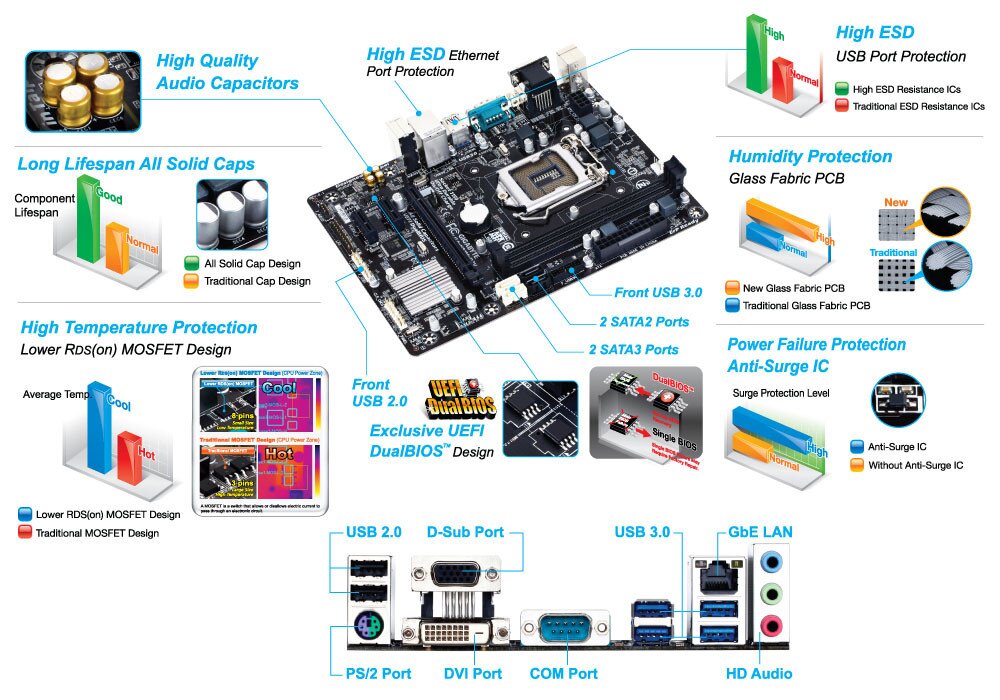 GIGABYTE 8 Series motherboards raise the bar in terms of protecting your system, providing advanced electrostatic discharge (ESD) protection for both your Ethernet LAN and USB ports, both common sources of ESD-related failures. Each LAN and USB port is paired with a dedicated protection filter that can withstand high electrostatic discharges, protecting your system from common electrical surges and even direct lighting strikes.