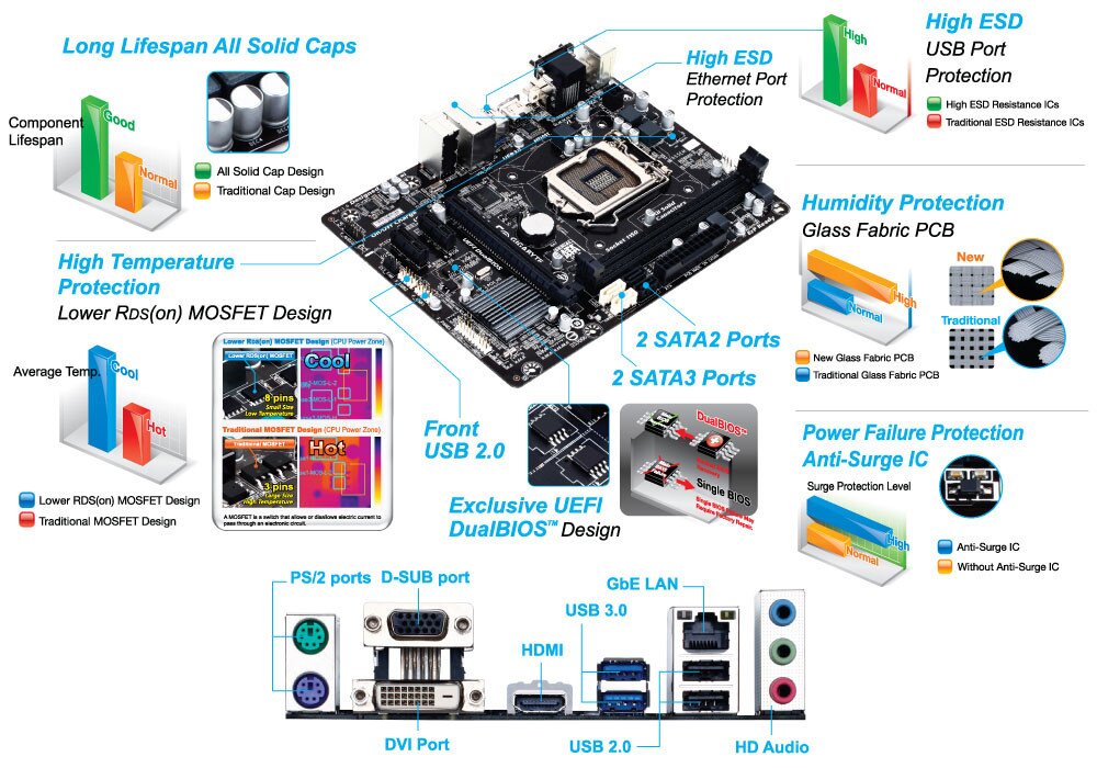 GIGABYTE 8 Series motherboards raise the bar in terms of protecting your system, providing advanced electrostatic discharge (ESD) protection for both your Ethernet LAN and USB ports, both common sources of ESD-related failures. Each LAN and USB port is paired with a dedicated protection filter that can withstand high electrostatic discharges, protecting your system from common electrical surges and even direct lighting strikes.
