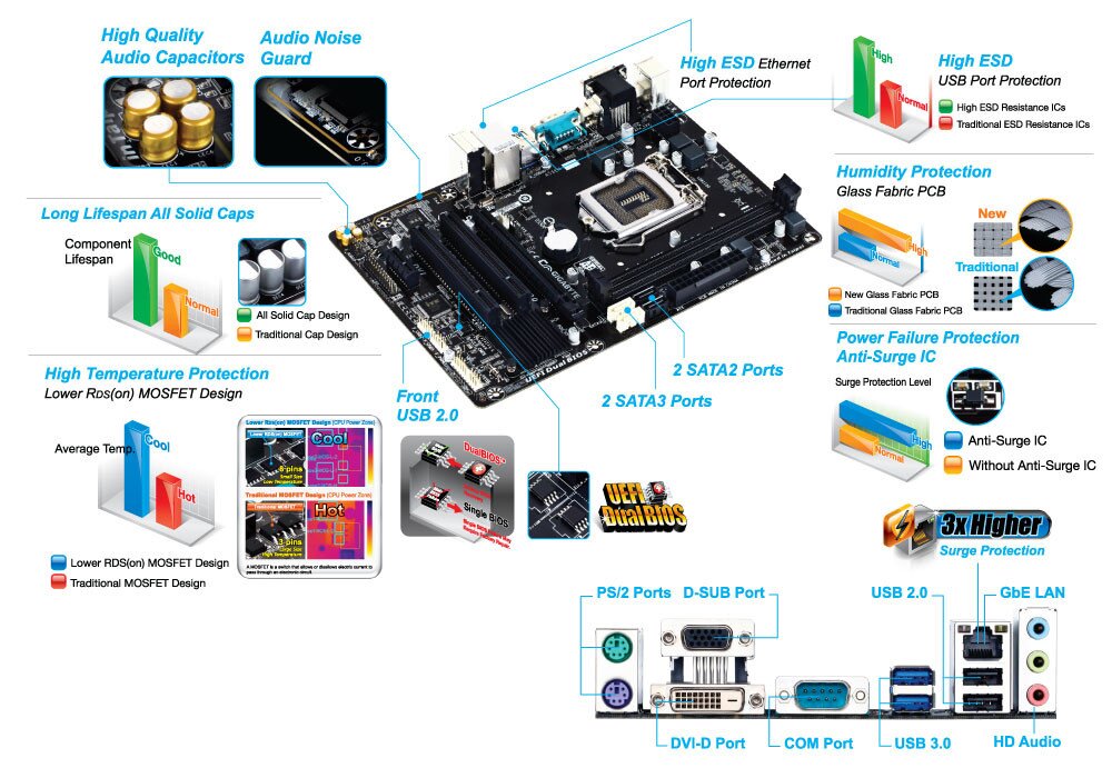 GIGABYTE 8 Series motherboards raise the bar in terms of protecting your system, providing advanced electrostatic discharge (ESD) protection for both your Ethernet LAN and USB ports, both common sources of ESD-related failures. Each LAN and USB port can withstand high electrostatic discharges, protecting your system from common electrical surges and even direct lighting strikes.