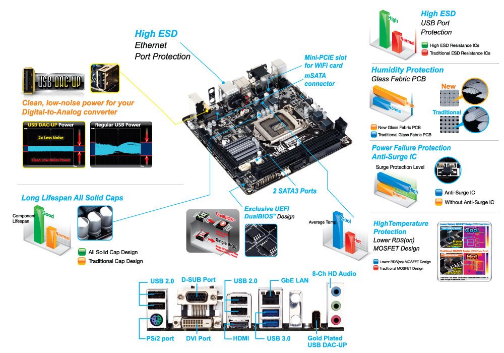 GIGABYTE 8 Series motherboards raise the bar in terms of protecting your system, providing advanced electrostatic discharge (ESD) protection for both your Ethernet LAN and USB ports, both common sources of ESD-related failures. Each LAN and USB port is paired with a dedicated protection filter that can withstand high electrostatic discharges, protecting your system from common electrical surges and even direct lighting strikes.