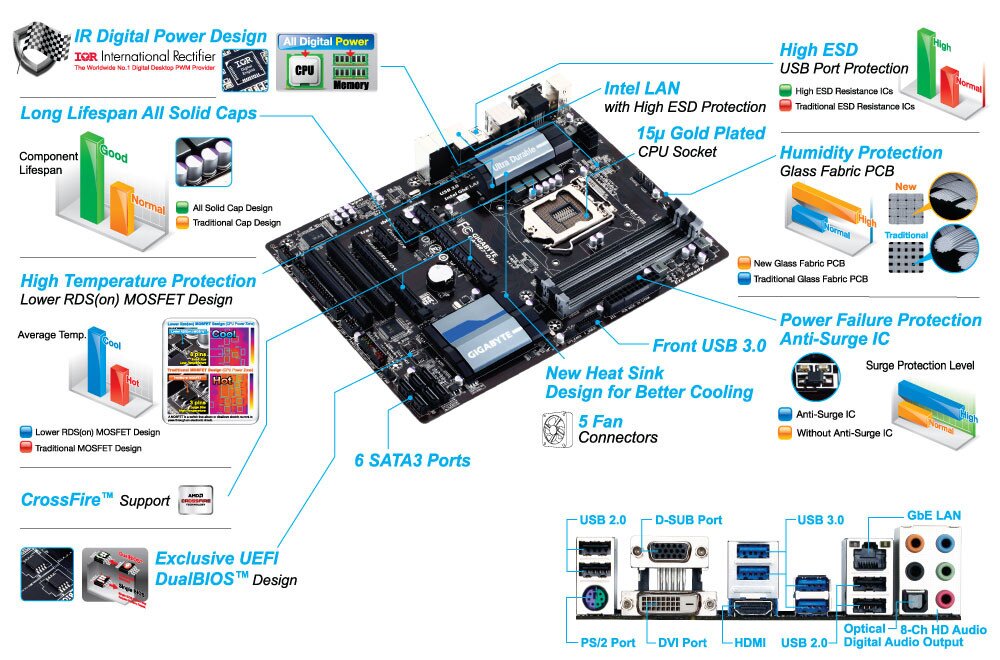 GIGABYTE 8 Series motherboards raise the bar in terms of protecting your system, providing advanced electrostatic discharge (ESD) protection for both your Ethernet LAN and USB ports, both common sources of ESD-related failures. Each LAN and USB port is paired with a dedicated protection filter that can withstand high electrostatic discharges, protecting your system from common electrical surges and even direct lighting strikes.