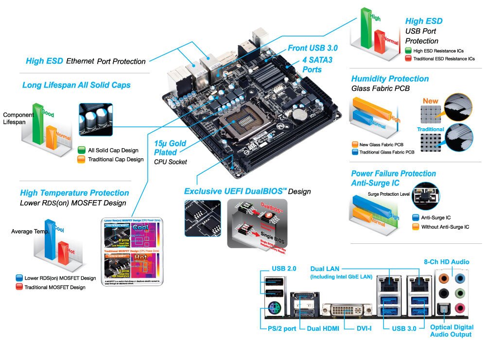 GIGABYTE 8 Series motherboards raise the bar in terms of protecting your system, providing advanced electrostatic discharge (ESD) protection for both your Ethernet LAN and USB ports, both common sources of ESD-related failures. Each LAN and USB port is paired with a dedicated protection filter that can withstand high electrostatic discharges, protecting your system from common electrical surges and even direct lighting strikes.