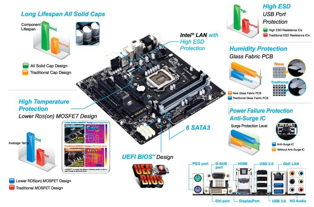GIGABYTE 8 Series motherboards raise the bar in terms of protecting your system, providing advanced electrostatic discharge (ESD) protection for both your Ethernet LAN and USB ports, both common sources of ESD-related failures. Each LAN and USB port is paired with a dedicated protection filter that can withstand high electrostatic discharges, protecting your system from common electrical surges and even direct lighting strikes.