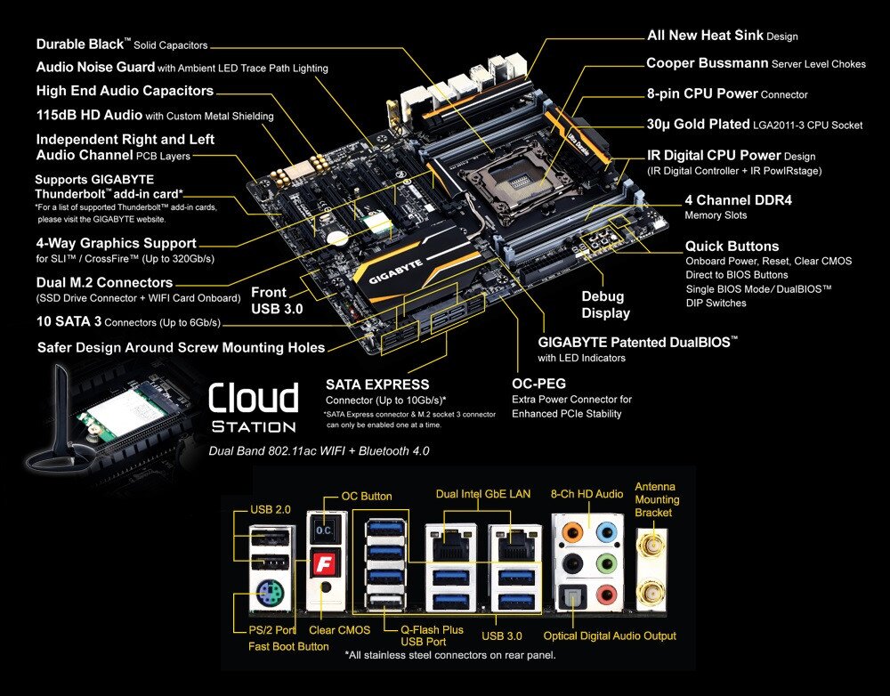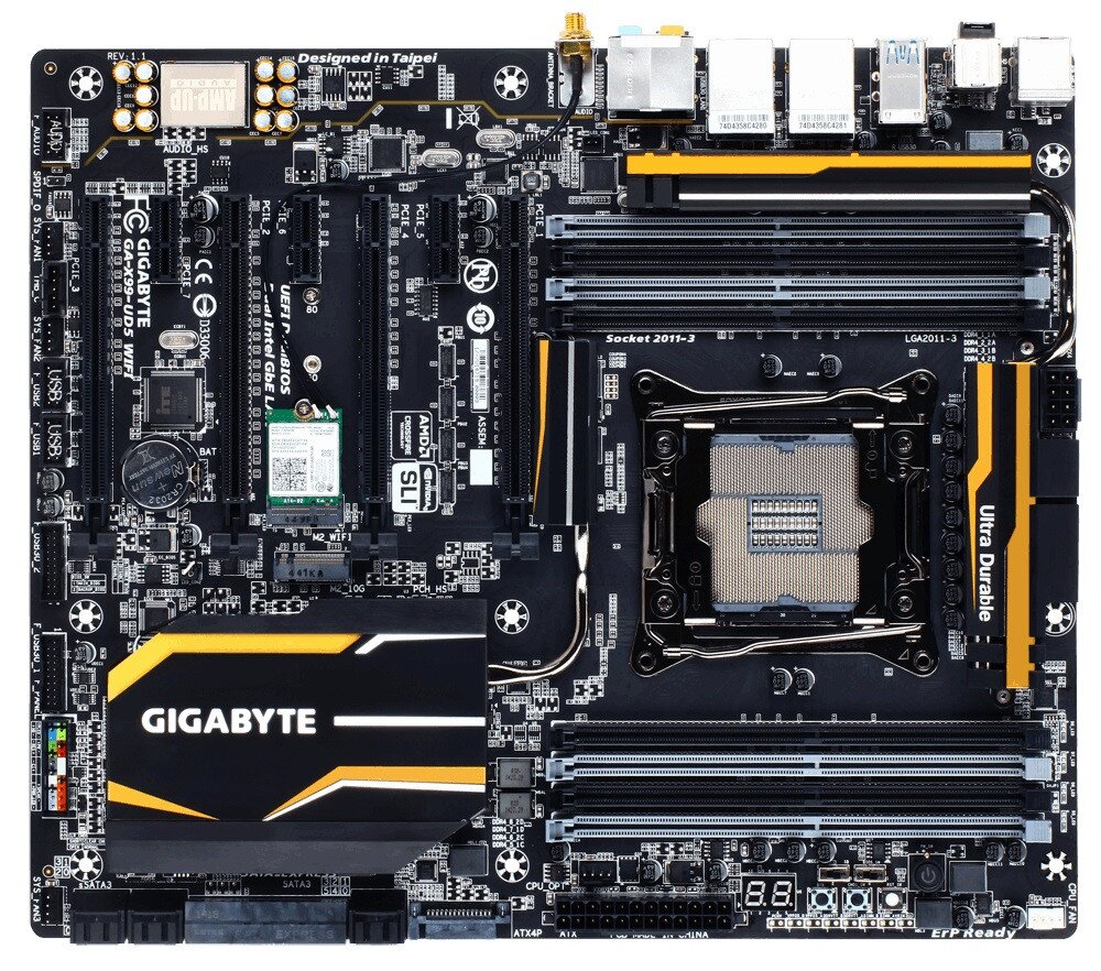 GIGABYTE X99 motherboards featuring Dual M.2 technology provides users PCI-Express connectivity for SSD devices and onboard 11AC WIFI + Bluetooth 4.0. Delivering up to 10 Gb/s data transfer speeds, M.2 offers considerably faster storage performance than current mSATA and even SATA Revision 3 (6Gb/s) storage devices. GIGABYTE's stacked design optimizes the PCB real-estate usage, allowing more components to be efficiently added without compromising any space.