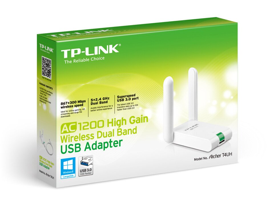 The Archer T4UH Wi-Fi Adapter upgrades laptops and PCs to fast AC1300 Wi-Fi speeds for smooth HD streaming and quick downloads. Switch between dual 5 GHz (867 Mbps) and 2.4 GHz (400 Mbps) bands to avoid crowded networks and Wi-Fi slowdowns for speed and range in any situation.