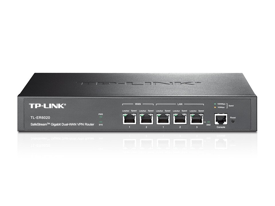 The TL-ER6020 SafeStream Gigabit Dual-WAN VPN Router from TP-LINK possesses excellent data processing capabilities and multiple powerful functions including IPsec/PPTP/L2TP VPN, Load Balance, Access Control, IM/P2P Blocking, DoS Defense, Bandwidth Control, Session Limit, PPPoE Server and so on, which consumedly meet the needs of small and medium enterprises, hotels and communities with large volumes of users demanding an efficient and easy-to-manage network with high security.